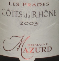| 製品名 | コート・デュ・ローヌ ”レ・プラド” ドメーヌ・マズール 2004 "Cotes du Rhone Les Prades Domaine Mazurd 2004" |